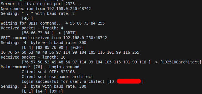- "L" byte, as LOGIN: syntax: "L123456username" where 123456 is the One Time Password for login the user: "username". This command should be the first command after a handshake (see below)